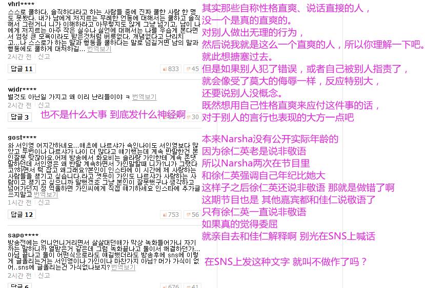 在佳仁说出自己因为这件事很生气以后,徐仁英立马反击说:“至于生气么?”并解释说,自己只是觉得Narsha太可爱了以为她比自己小。对此佳仁说,Narsha后来在节目里和徐仁英说过自己比她年纪大,但那之后徐仁英仍旧对Narsha喊“喂”。