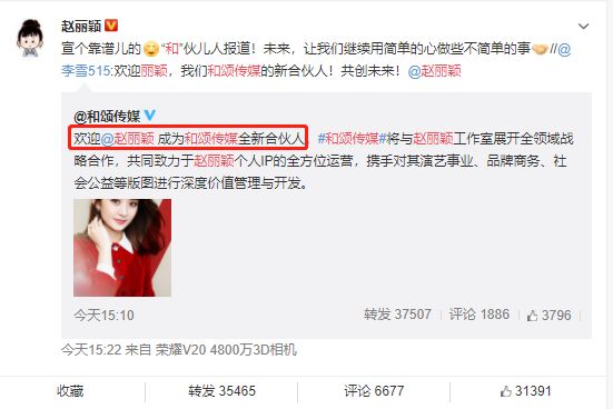 和颂传媒宣布“欢迎赵丽颖成为和颂传媒全新合伙人”。