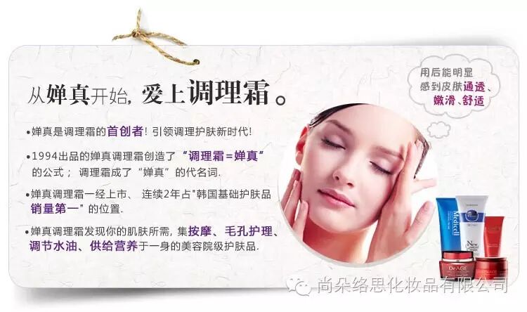 婵真,韩国基础护肤的第一名品,韩语是"非常好"的字意。婵真用他人所无法模仿的独家配方经验和皮肤科学知识,开发研制了在世界上独一无二的婵真名品,颇受顾客们的青睐。婵真87年进入美国的芝加哥和夏威夷,91年首家获得在日本市场的销售许可,这是韩国第一家进入日本化妆品市场的国产化妆品公司。到1994年婵真在国内机内免税店开始销售、1996年获得品质保证Q证。一直以领先一步的品质,先后得到了广大顾客们的品质上的认可。2001年被韩国能率协会选定为〈女性化妆品第一品牌企业〉,为了满足全世界女性对婵真化妆品的需求,婵真逐渐地开拓了海外市场。目前正向日本,美国,中国,马来西亚,菲律宾,俄罗斯,澳洲,巴西,加拿大,台湾等国家和地区扩展出口项目。