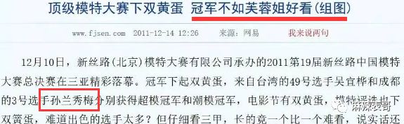 她2011年的时候参加新丝路西部模特大赛,拿下了冠军,那个时候她还叫孙兰秀梅。