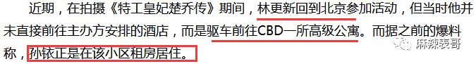 据跟拍的媒体表示,林更新在拍摄《楚乔传》期间,回北京的时候,经常驱车前往CBD一所高级公寓,而那个地方正是孙铱的住所。
