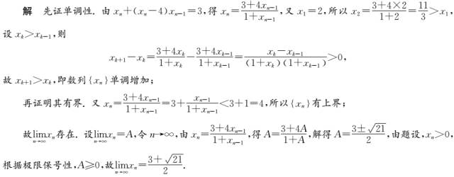 数列通项是通过递推关系式给出来的,这种题目一般用单调有界准则来证明极限存在,然后再求极限。证明方法一般用到数学归纳法,求极限的方法为设数列极限为A,在通项两端同时取极限,得到一个关于A的方程,解出A即为极限值。看解析: