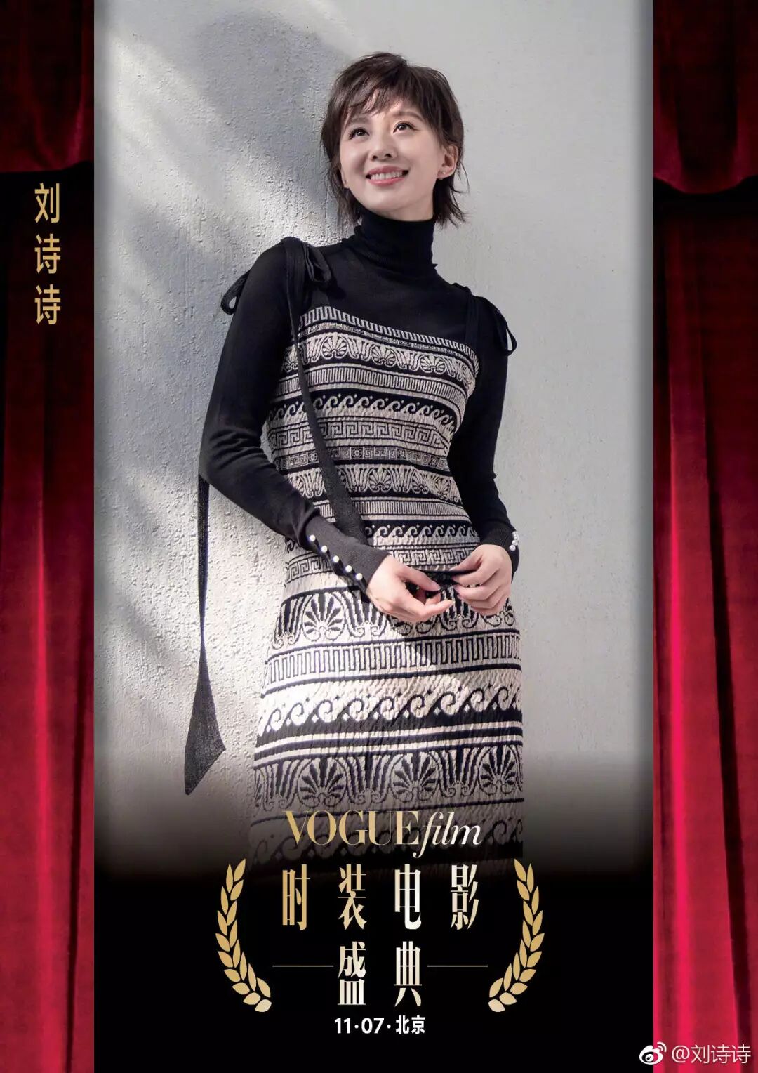 在时装电影盛展上,她没有身着华丽的礼服,只是一个简单的黑色高领针织和一条长裙,气度仍不失优雅;