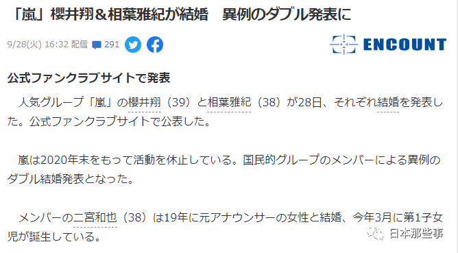 樱井翔和相叶雅纪通过FC宣布婚讯,他们的结婚对象都是圈外女性。(又是圈外女性的胜利...)