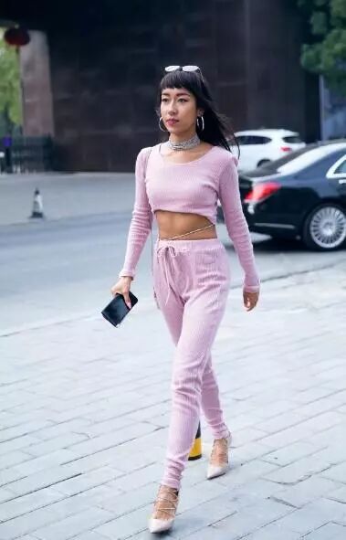 街拍也是穿的很大胆,粉色的针织套装本以为穿出来是很甜美的感觉,可是穿在她身上,黑黑的皮肤与粉色真不搭呢,而且这种裤子感觉就像是秋裤啊, 上半身还要卷着露腰,真是醉了!