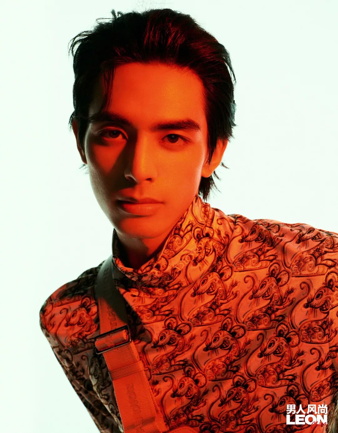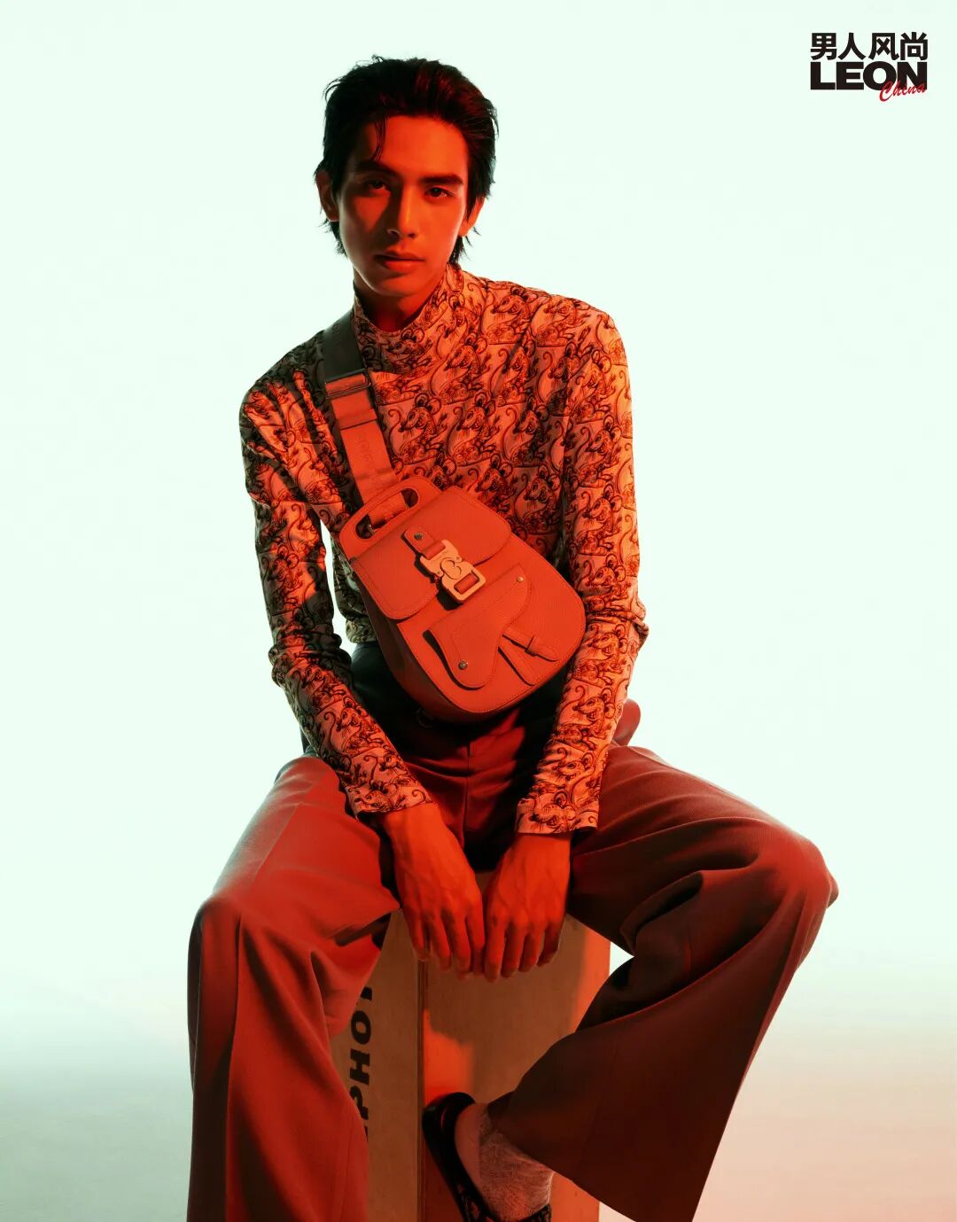 白色生肖高领丝质长袖、浅灰色小牛皮挎包 / 均为迪奥二零二一秋季男装系列