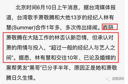 但当时林有慧否认和萧敬腾相爱,同时承认对于萧敬腾的用情和投入超过了一般的经纪人与艺人之间。