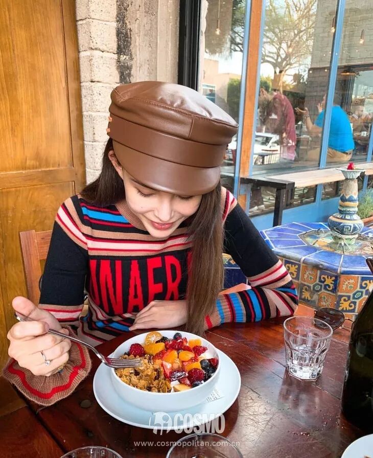 最惹眼的要数那顶棕色皮质报童帽,自带一种复古的英伦范儿,宽宽的帽檐显得脸只有巴掌大小,戴上墨镜就是名副其实的巴掌脸无遗了。