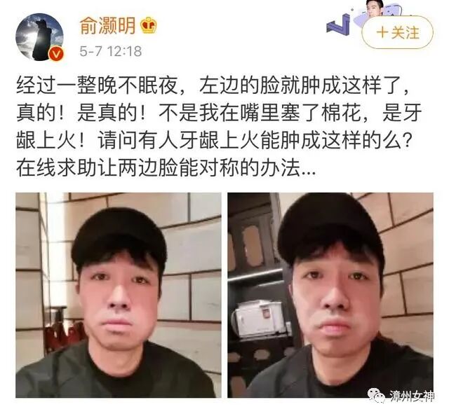 5月7日,俞灏明在个人社交平台发布了一条动态,抱怨自己因为牙龈上火肿了大半张脸,像是“在嘴里塞了棉花”。所以他只能上线向广大网友们求求建议,“在线求助让两边脸能对称的办法”。