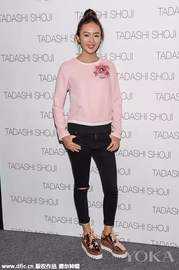 第一次来到纽约时装周的童瑶,身着Tadashi Shoji 2016新款卫衣观秀,丸子头活泼可爱。