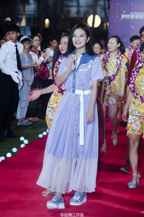 赵薇现身首届马云乡村教师奖颁奖典礼时,身穿Sacai的蓝色衬衫长裙,脚踩牛仔布面的星星厚底鞋。