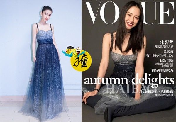 韩国的宋智孝欧尼,在为台版《Vogue》拍摄封面时也选择了这条星空裙,而懵智选择一双黑色长靴来搭配,让这条唯美的裙子又增添了一丝率性。