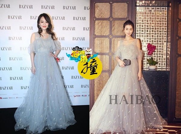 接下来撞衫的是这两位大美女,第一位就是我们新疆美女佟丽娅啦,丫丫身穿Shine Moda刺绣抹胸连衣裙亮相某活动,长直发垂肩,优雅大方,只是丫丫最近又瘦了,让人心疼,要注意身体哟!