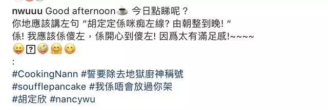 不过现在还是农历正月,胡定欣也没有四处登台演出,没剧在身的胡定欣就在这个农历正月频频在其社交网站上上载其做食物的照片。同时胡定欣在其每个发文的下面都hashtag“誓要除去地狱厨神称号”。而胡定欣之所以会有这个称号,是因为她在《美女厨房》的表现,不仅做不到美女厨神,而是做了地狱厨神。