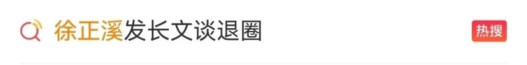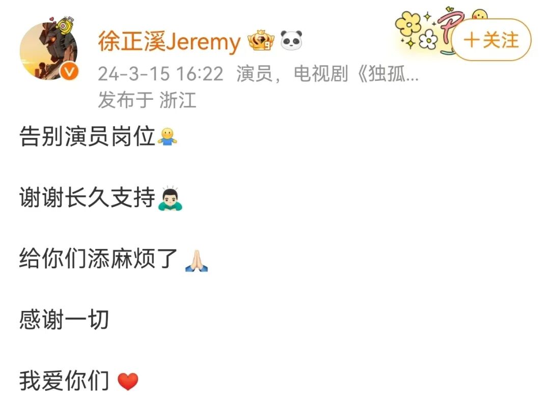 今年3月15日,徐正溪突然发文官宣退圈,他称“告别演员岗位,谢谢长久支持,给你们添麻烦了,感谢一切,我爱你们。”并在评论区补充:“会完成手头上的目前接纳的工作。”