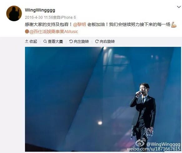 自从获黎明宠幸后,阿Wing的微博则转为帮黎明大力宣传,仲经常老板前老板后,卖晒口乖。