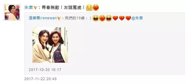 近日,温碧霞晒出和朱茵的合影旧照,并写道:“我们的18岁!”11月22日,朱茵转发并配文:“青春无敌,友谊万岁!”