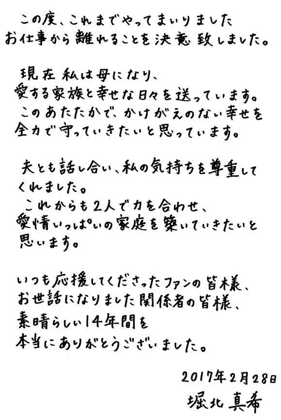 堀北表示,做了母亲的自己现在生活幸福,希望守住这份无可替代的快乐,因此决意结束演员工作。她和丈夫山本耕史商量过,“将从现在开始,合二人之力共筑充满爱情的家庭”,并对粉丝们“在这精彩的14年里”对自己的支持表示感谢。事务所方面则表示,尊重堀北的选择。