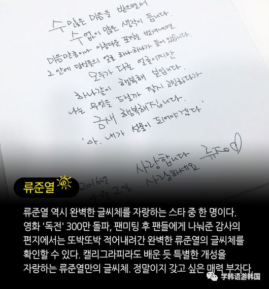 柳俊烈果然也是拥有着完美的字样,因为拍摄电影《毒战》创下了突破300万观影的好成绩,举办了粉丝见面会之后,亲手给粉丝们写信,传达了自己的感激之情,没有连笔字迹,一个字一个字清清楚楚的写好,可见他也是一位认真踏实的好演员,日后一定会越走越高!