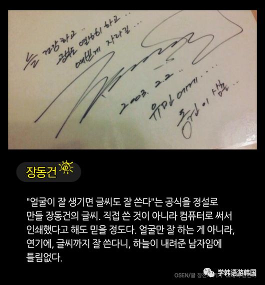 张东健的字迹同样工整,有力,一看就知道是一个做人做事十分有规矩的演员,作为原始雕塑美男,能够始终保有完美男人的好口碑,一定对自己有着严苛的要求,简直就是上天赐予大众的礼物!