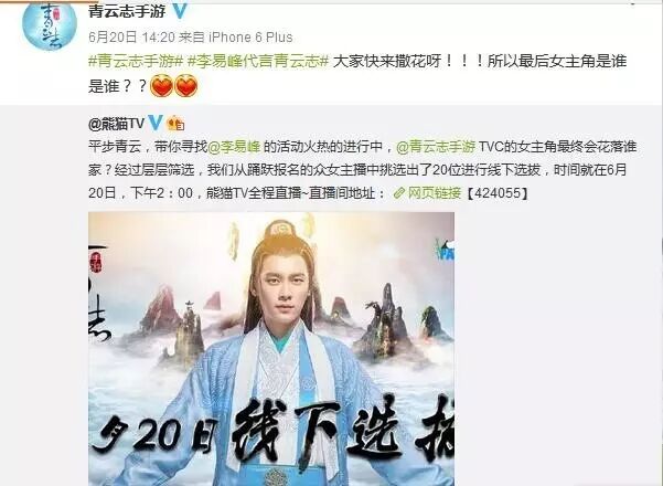 你或许没有倾国倾城的容貌,你或许从没接受过正规表演训练,你或许自认为只是一个平凡的girl,但就是这样的你却可能成为李易峰代言的青云志手游的TVC女主角。线上呼风唤雨驰骋青云,线下星途坦荡万人瞩目,无论是在虚幻的手游世界,还是在现实生活中,只要你有梦想青云君定助你一臂之力。