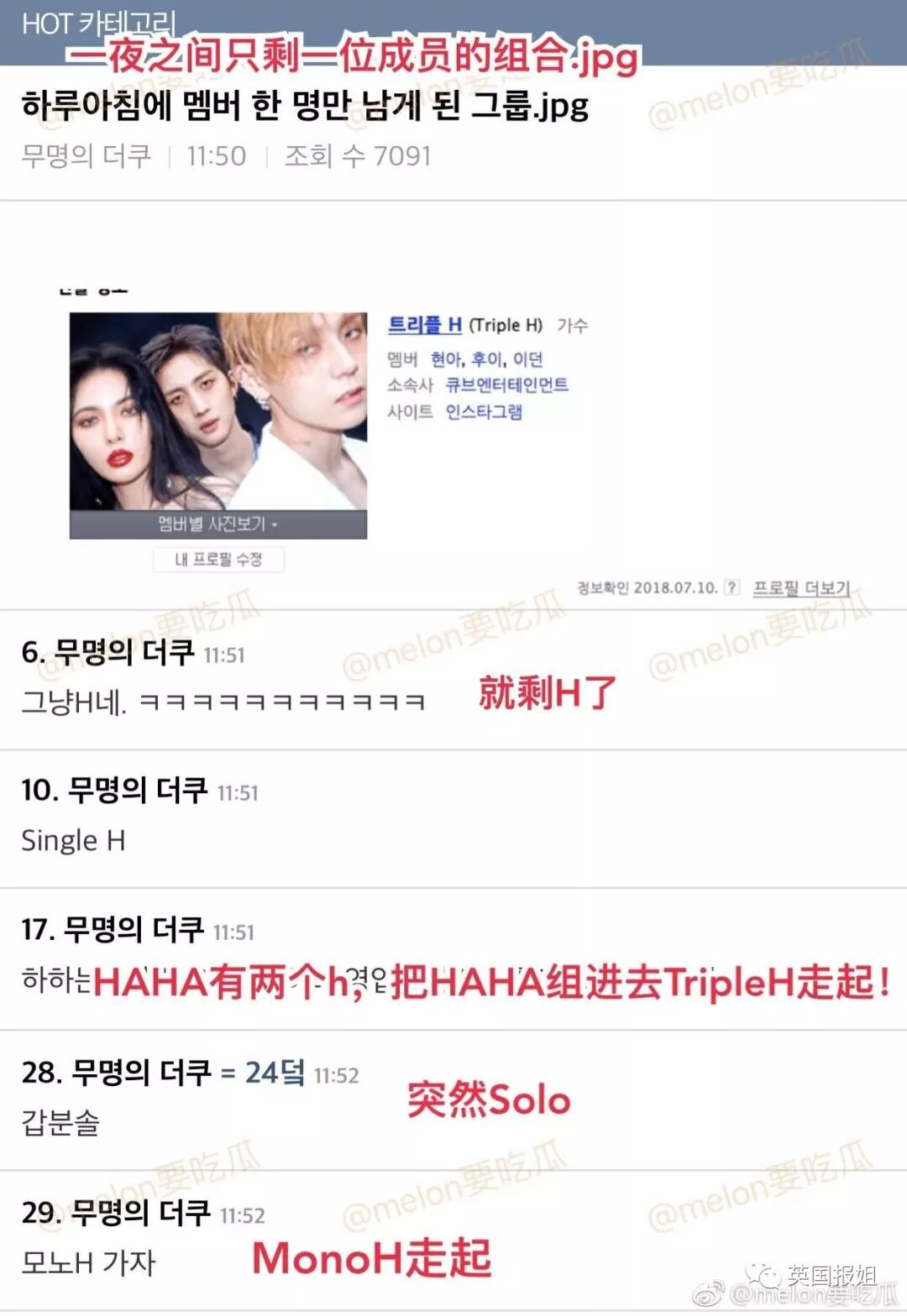 也有人调侃说,泫雅和其男友所在的CUBE社内三人组合Triple H ,一夜之间只剩下一个人了。