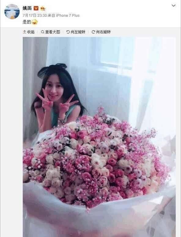 被拍到后,姚笛随即在微博贴出自己和鲜花的合影,并配文:“是的”。大方承认了恋情。