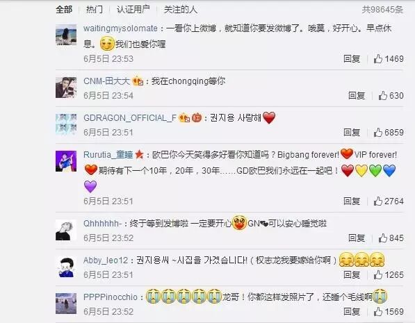 GD和TOP的帅或许是粉丝看重的一个点,而众多少女粉丝在他们面前就是零智商。通过微博就能看出这些少女的车祸现场心。