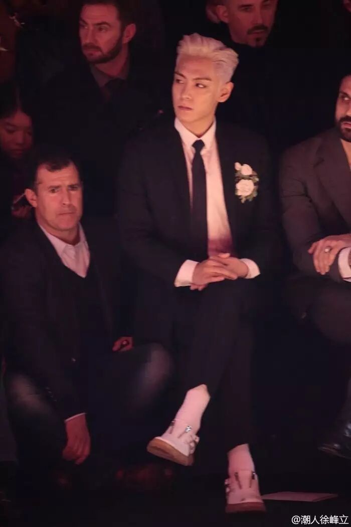 时装周:TOP还真是喜欢西服套装,这种中规中矩的款式,TOP驾驭的还就是轻车熟路。白色袜子和白色鞋子的搭配不俗,反而被穿出了十大经典搭配的感觉!那小眼神,迷死了!