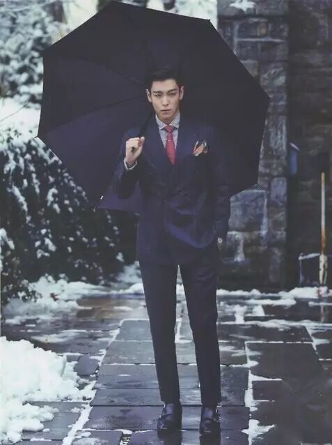 街拍:依旧是西服套装、手拿黑色雨伞。还是绅士的感觉,TOP的外貌加着一身绅士装扮,就是完美的结合。胸前的手帕巾加分!这大长腿,秒杀一众小男人。