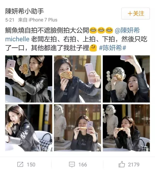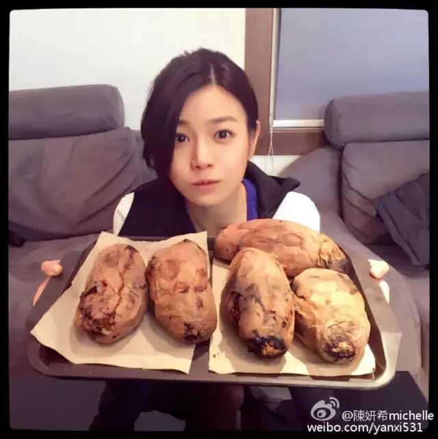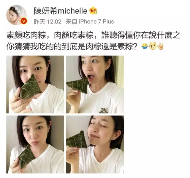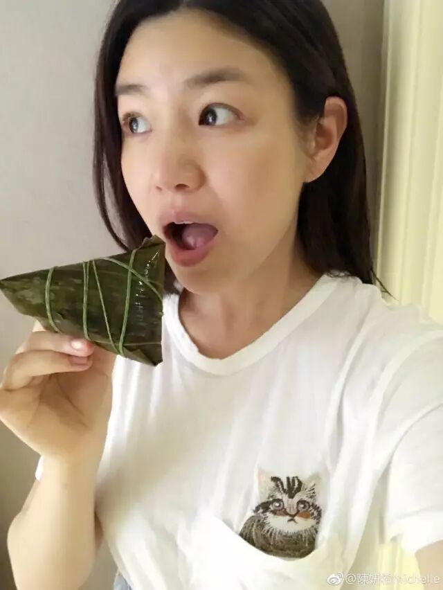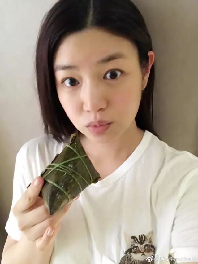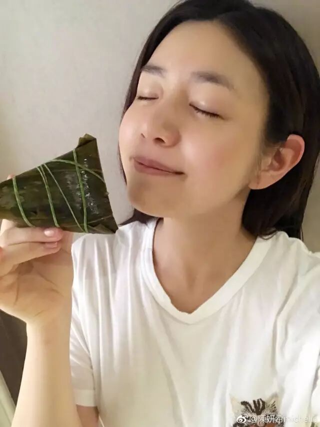 这一战,陈妍希赢得相当漂亮。端午节时候,她在微博上传了几张素颜吃粽子的自拍。