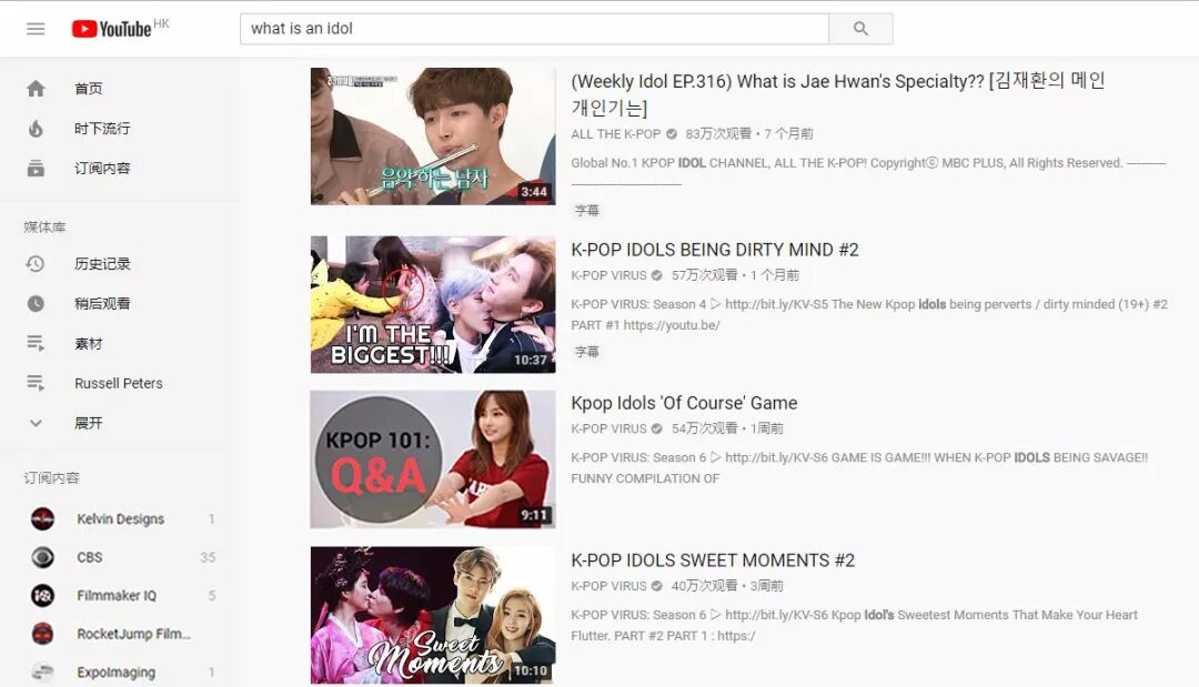 打开YouTube(香港)搜索“What is an idol”(什么是偶像),弹出来的结果几乎被韩国Kpop偶像占据。这能大致看出亚洲地区对偶像的标准,明显受韩国娱乐产业的影响,个人形象占据了非常重要的地位。所以很多艺人不惜冒着毁容的风险去整容也就不难理解了。