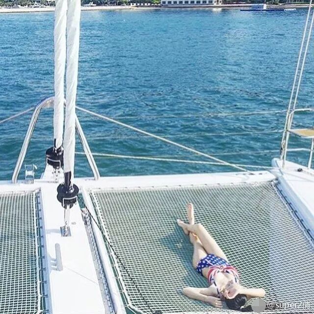 李小璐豪华游艇上身穿比基尼享受海风和日光浴。