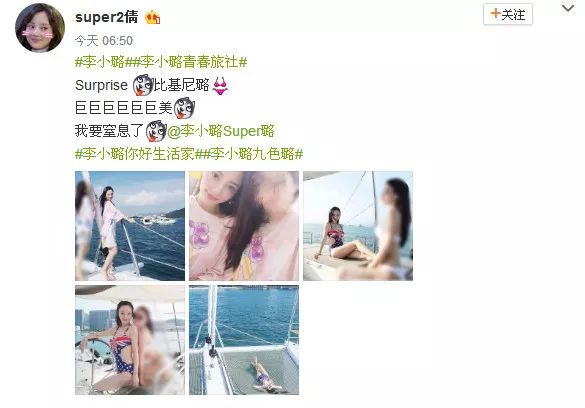 10月21日有网友曝光一组李小璐和美女闺蜜一起,在海上豪华游艇上的比基尼性感美照。该网友被李小璐的美照暴击,兴奋异常直夸李小璐为“比基尼璐”巨巨巨巨巨巨美,要窒息了受不了。