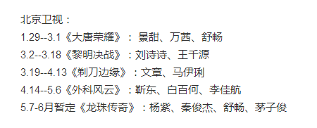(以上剧目皆为预排档,最终以各大卫视实际播出为准。江苏卫视、浙江卫视、东方卫视、北京卫视、山东卫视资料来源:@影视剧透社V;湖南卫视资料来源:百度贴吧)