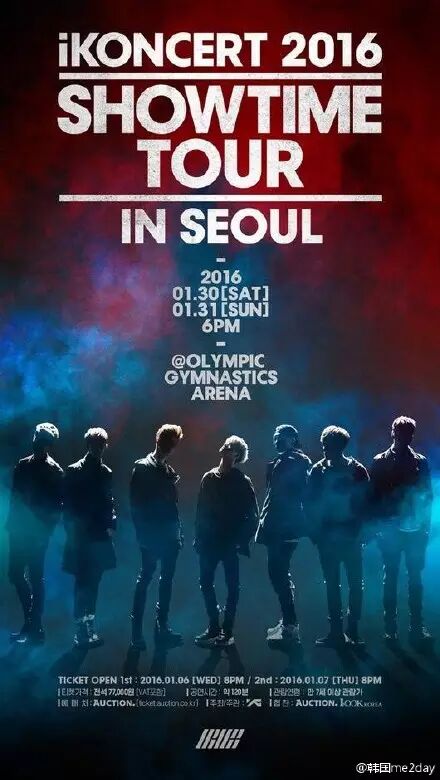 29日上午YG通过官方Blog公开了旗下组合iKON将于明年1月30日-31日在首尔奥林匹克公园体操竞技场举办的单独演唱会“iKONCERT 2016 SHOWTIME TOUR IN SEOUL”海报,根据海报信息,演唱会门票将于1月6日-7日开始预售,引发粉丝们的强烈关注.