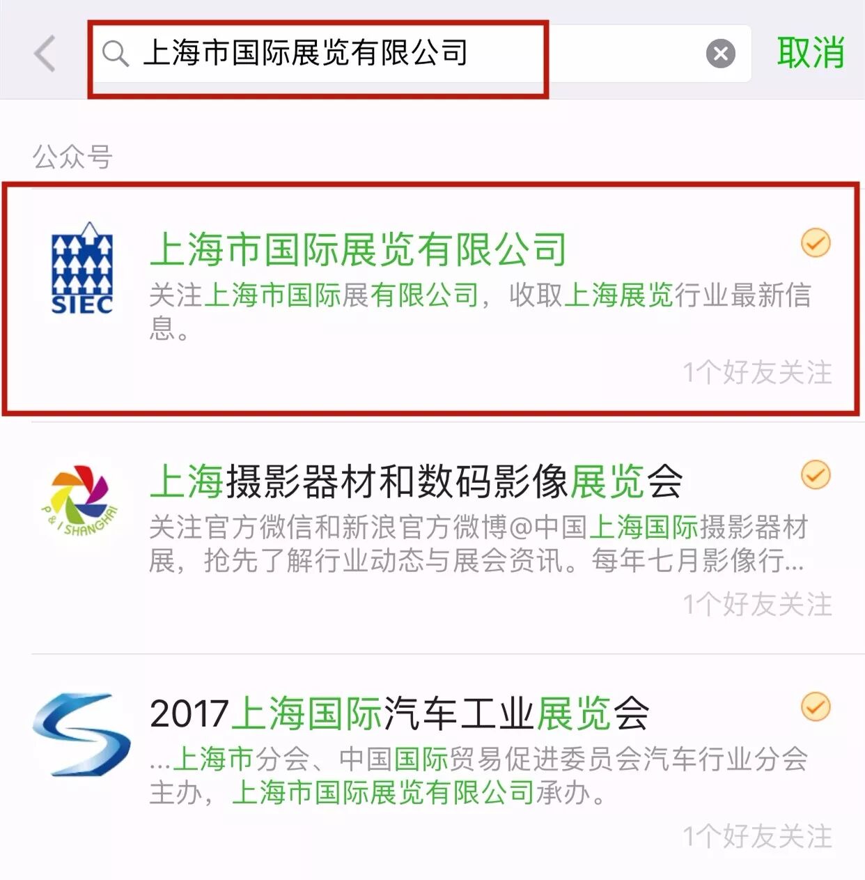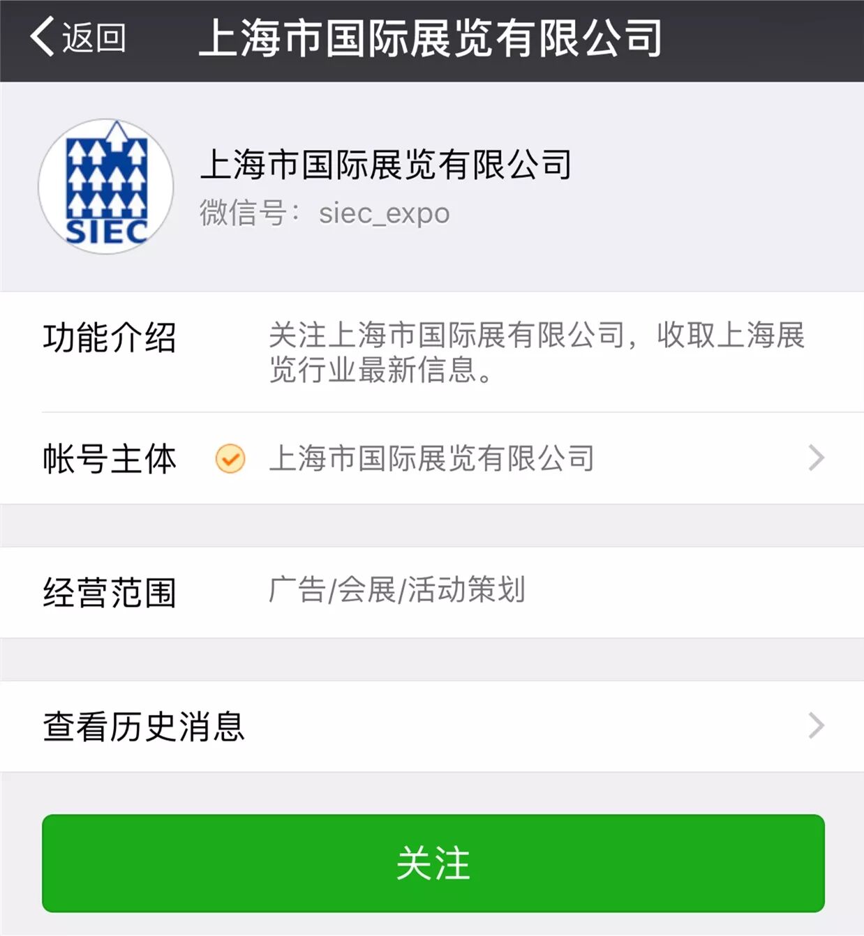 随后,进入微信,关注“上海市国际展览有限公司”的公众号(siec_expo)。
