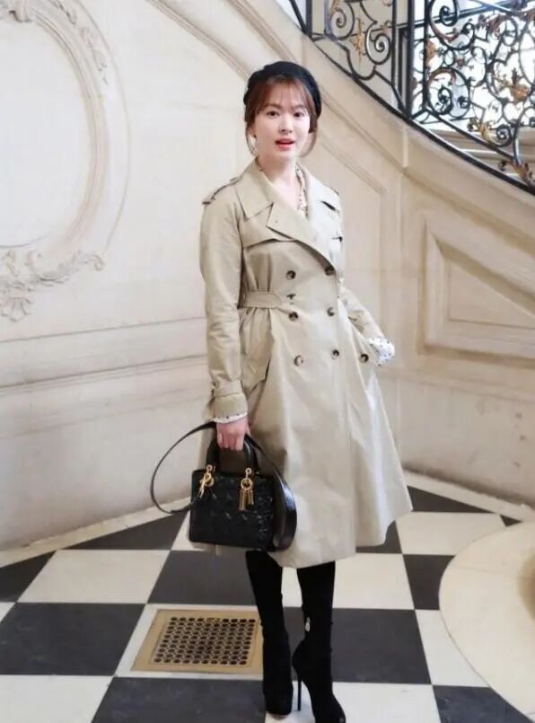 让我们放大宋慧乔京的整体照片。米色风衣配黑色靴子,带贝雷帽,真的很洋气,但是腰不见了。你真的怀孕了吗?