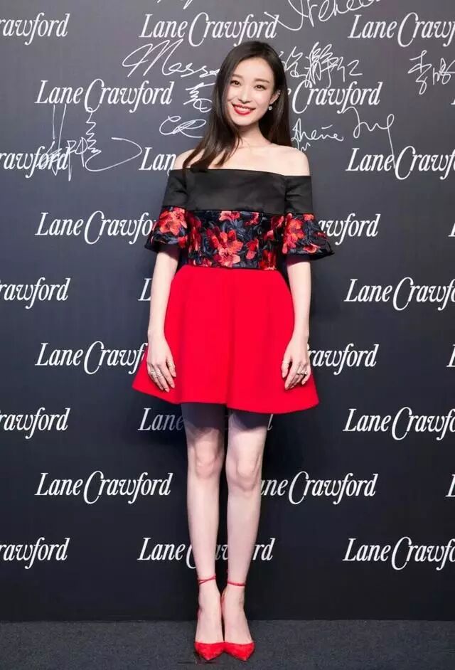 倪妮这个气质女神穿印花露肩装搭红色短裙,脚踩红色绑带鞋,很热情活泼又吸睛。