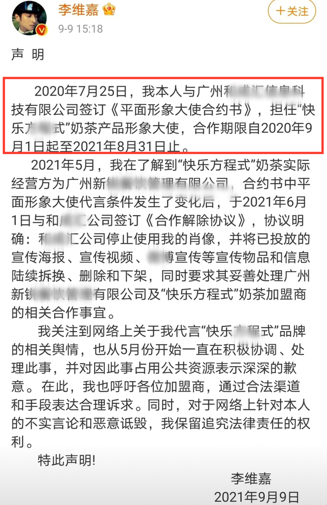 后来,李维嘉发文澄清,表示自己和某茶饮公司的合约早已终结,他一直在积极协调,希望能帮这些加盟商维权。