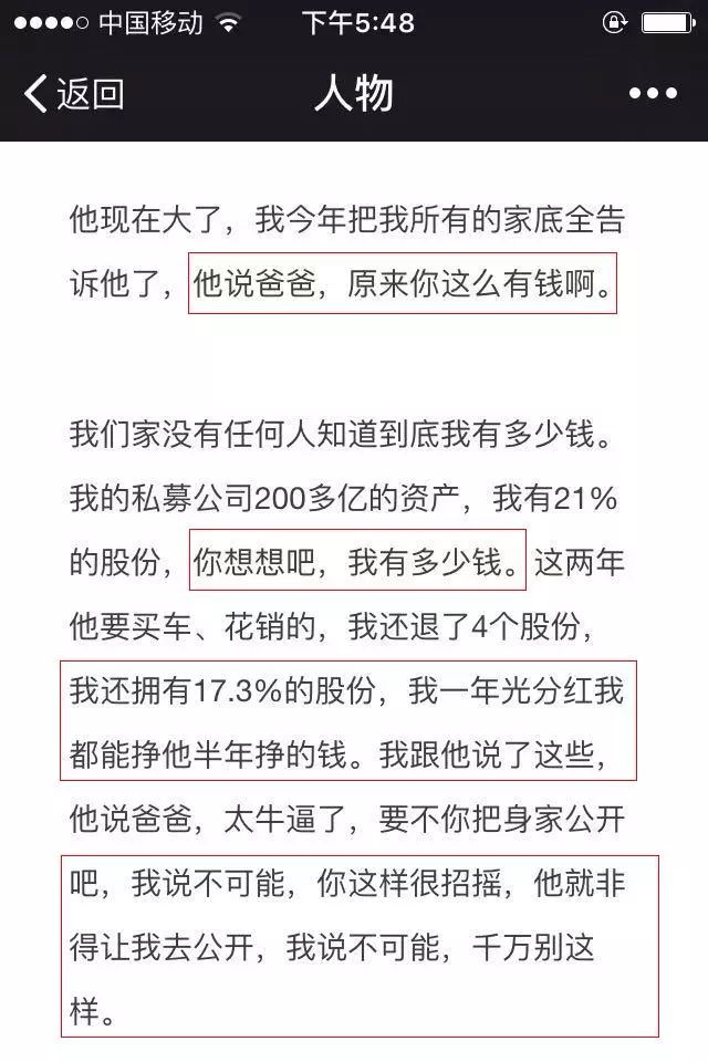 我们再看黄子韬爸爸的访谈,也是曲折坎坷颇具传奇。文中说,黄忠东经营着一家200多亿资产的私募公司,自己占有21%的股份。1997年还登上了青岛财富榜第7名。2002年被秘书骗了500万,后来打扑克一个星期赚3000块,靠着4万块钱资本做到了今天207个亿的公司,这两年因花销增多退股到17.3%,天眼妹粗略算了一下,那也有将近36亿啊!