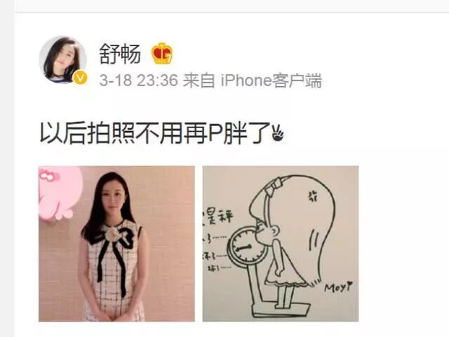 但是最近舒畅发微博的时候,却晒出了自己的一张发福照,并且搭配的文案真的是气死人。舒畅说以后拍照再也不用p胖了。第1次看到有人,在发照片的时候故意把自己逼胖也真的是气死个人。