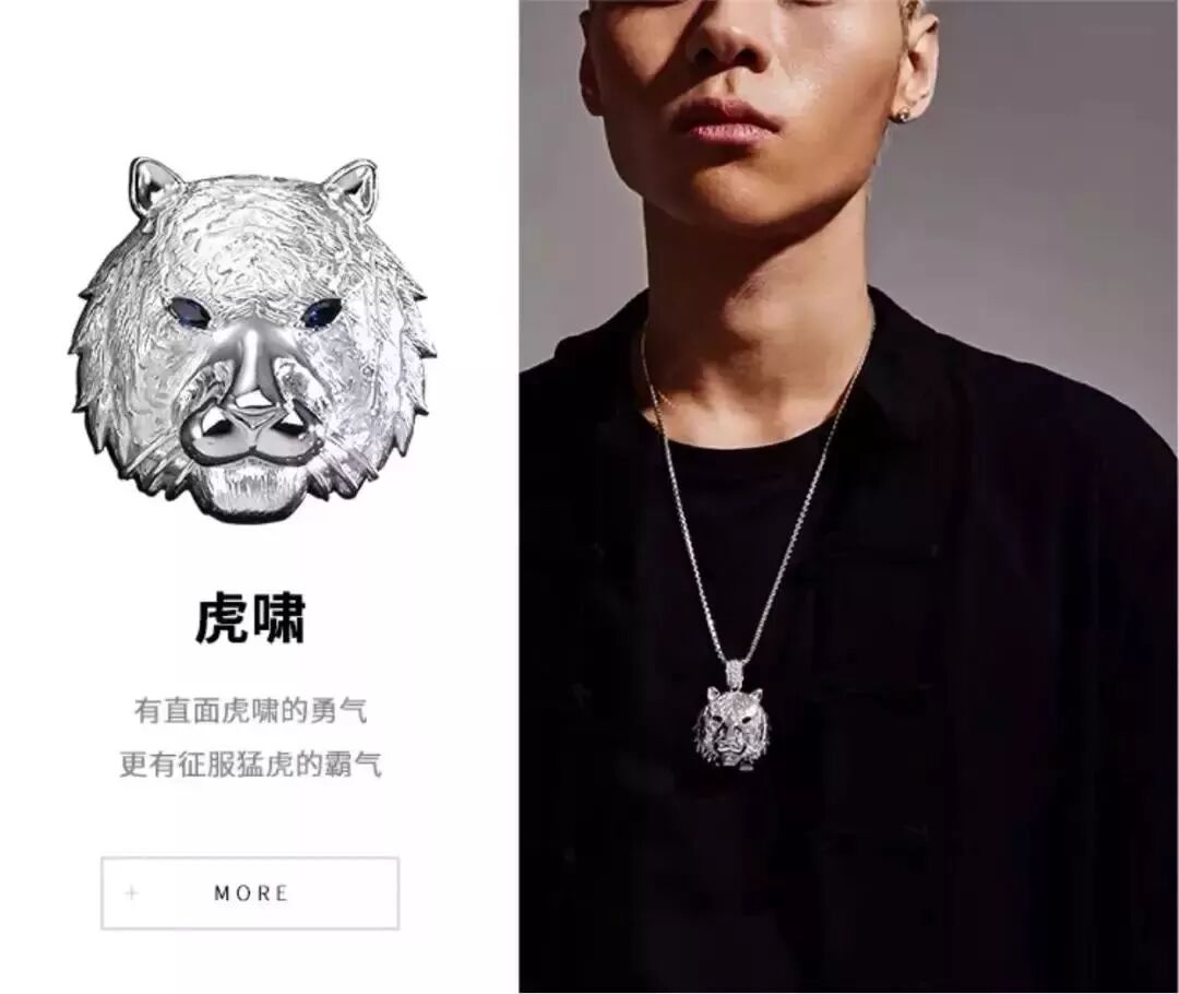 我们来看看这一饰品品牌的设计:首先是有着中国元素的“虎啸”、“龙吟”,一金一银的配色与寓意倒是很吉祥,配饰上直接用到了龙和虎的头像。