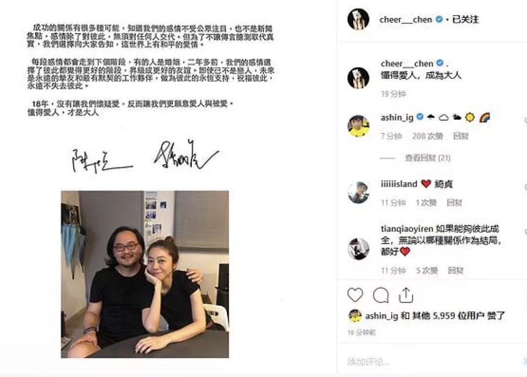 陈绮贞在个⼈社交账号⾥发⽂,宣布与相恋⼗八年的男友钟成⻁分⼿: