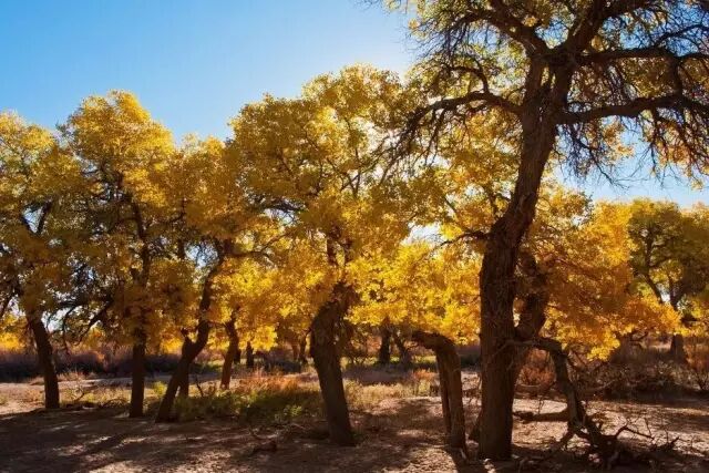 每当9月末胡杨的树叶全部变黄时,湛蓝的天空下,金色的胡杨林海就犹如灿烂的太阳照亮了整个额济纳。