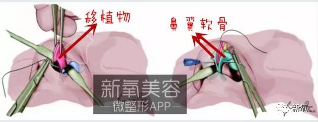 上图看不太懂的看下图,图中的移植物也就是上面提到采取的部分鼻中隔,然后将移植物与鼻翼软骨缝合固定。