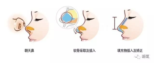 我们知道朝天鼻的最主要原因就是鼻尖、鼻小柱长度不够,以及隆鼻后挛缩引起的鼻尖向上,鼻孔外露。在鼻小柱上段用自体软骨加高鼻小柱长度,延长鼻尖,朝天鼻就消失了。这就是鼻尖鼻小柱延长术。