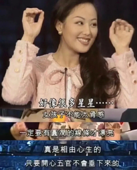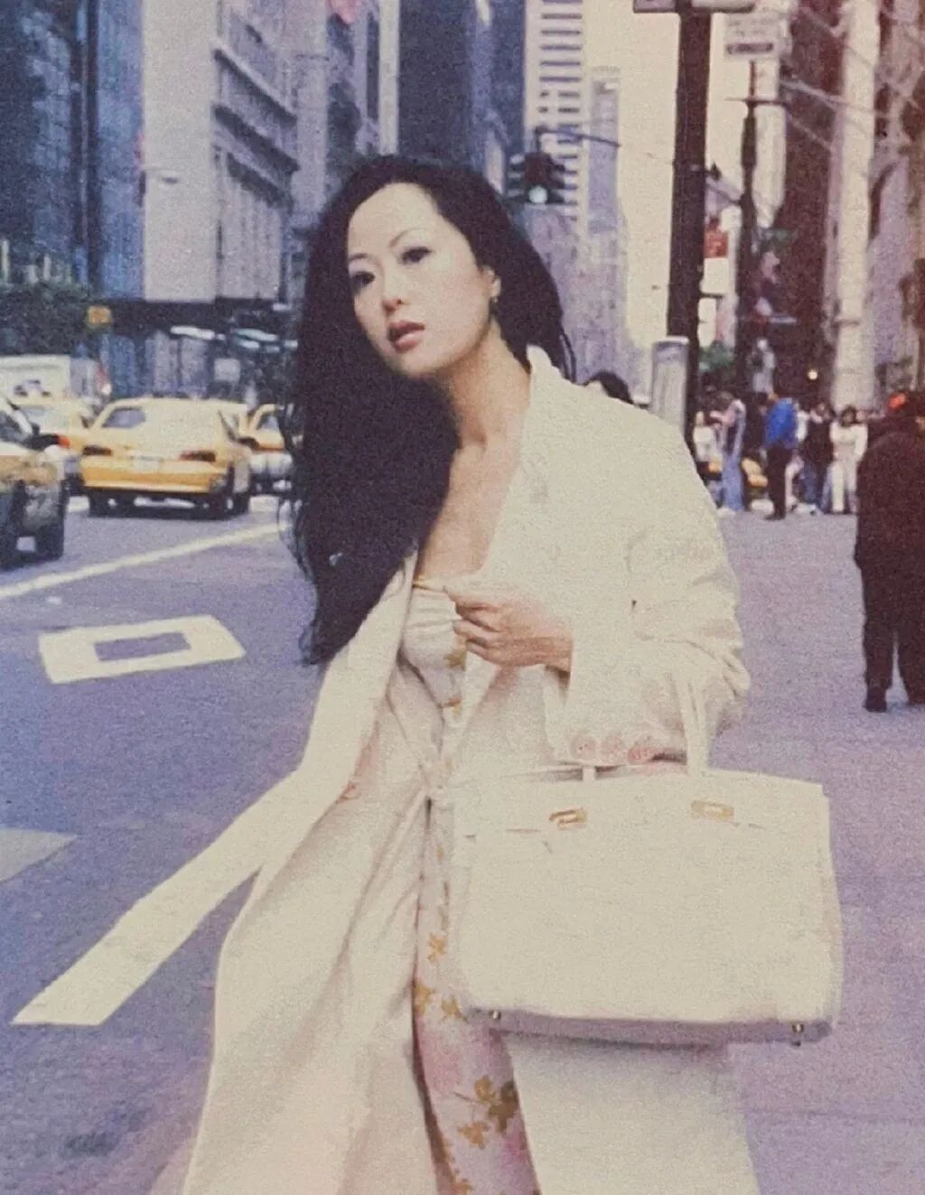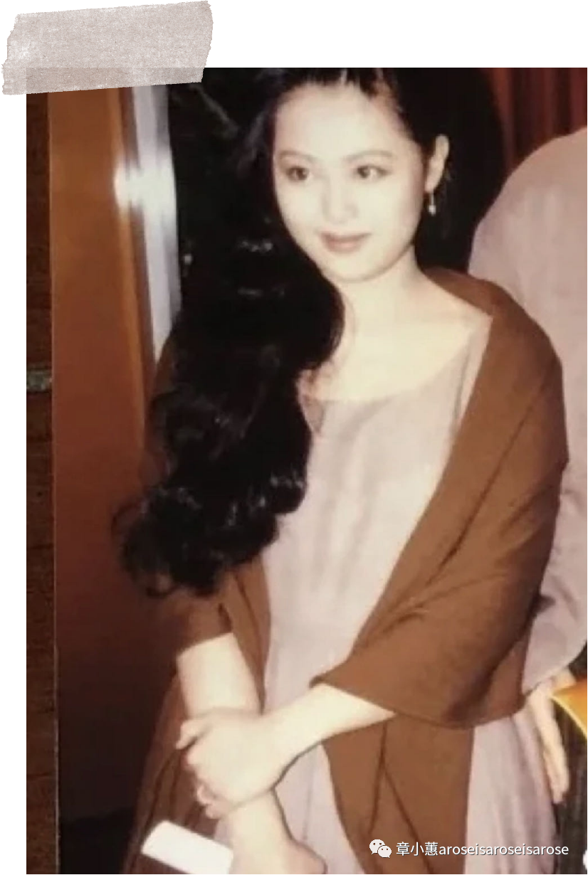90年代,章小蕙穿着Prada藕粉色棉麻连衣裙,搭配深芥末色羊绒披肩,天然面料亲肤柔软,剪裁自然,颜色柔和高级,衬托着章小蕙温婉中不失贵气。