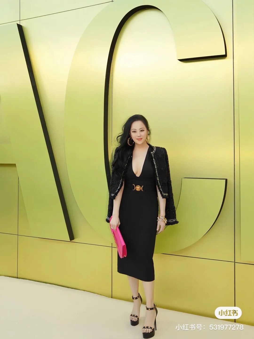 Versace秀场活动中,章小蕙一身黑色深V紧身礼服裙搭配同色系小香风外套,妩媚中不失利落,面料、结构、剪裁的美感交织呈现,钉珠和金属装饰显露出高级感满满的精致。