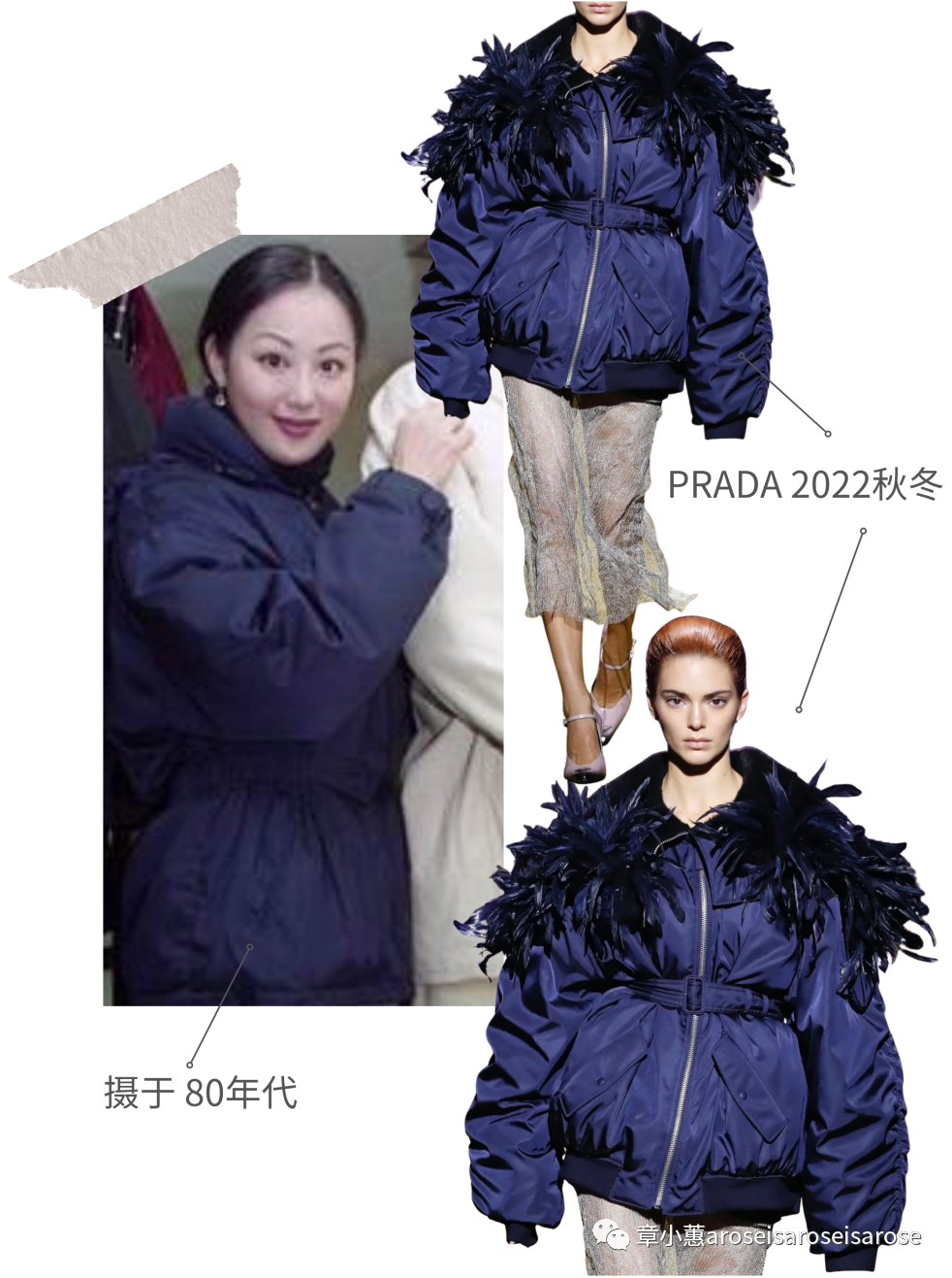 80年代的章小蕙一身紫罗兰色的Prada尼龙羽绒外套,防水的尼龙面料穿起来实用性十足,整个人看起来既简约大方又舒适。